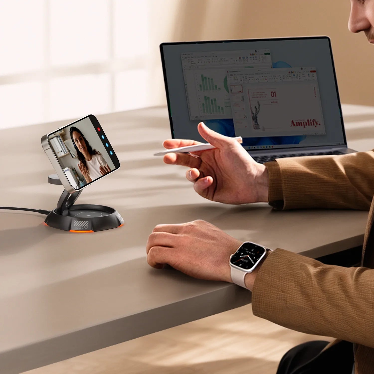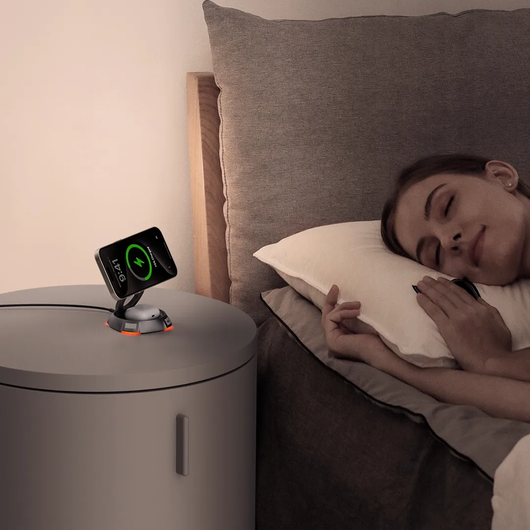 Say goodbye to tangled cables and awkward angles. The 360-degree swivel base lets you rotate your iPhone freely—horizontal or vertical—for seamless charging, FaceTime, or video calls. Each turn clicks smoothly for a satisfying, stress-relieving experience.