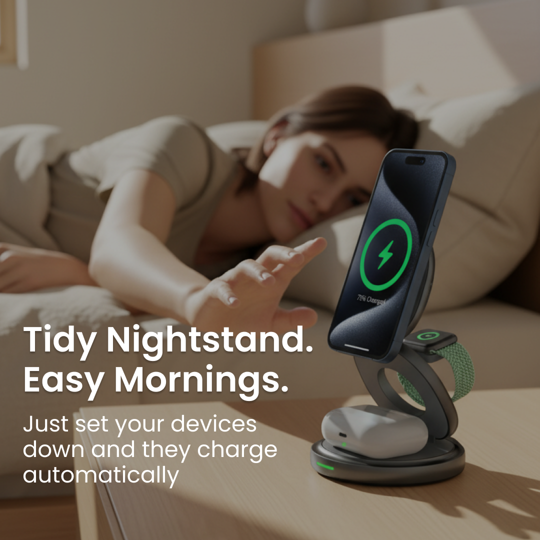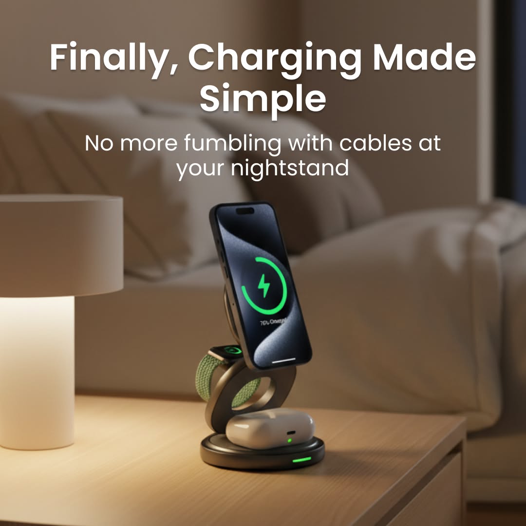 Power your phone, watch, and earbuds together—no extra cables, no clutter. This 3-in-1 wireless charger keeps your setup clean and efficient at home, work, or bedside.